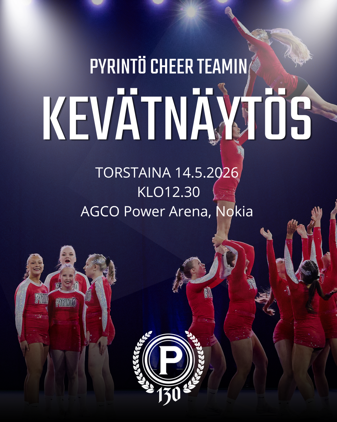Lipunmyynti aukeaa 21.4.2026 klo 12.00. Liput myy Tiketti: https://www.tiketti.fi/pyrinto-cheer-team-kevatnaytos-2026-agco-power-arena-nokia-lippuja/117134