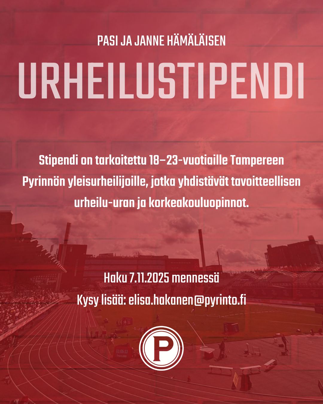 Stipendi on tarkoitettu 18–23-vuotiaille Tampereen Pyrinnön yleisurheilijoille, jotka yhdistävät tavoitteellisen urheilu-uran ja korkeakouluopinnot ✨ Tavoitteena on tukea ja kannustaa lupaavia urheilijoita matkalla kohti kansallista ja kansainvälistä huippua – sekä auttaa urheilun ja opiskelun yhdistämisessä 🤝🏼